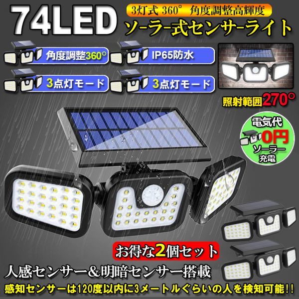 即納 2個セット3灯式 74LED ソーラー式 センサーライト 360°角度調整可能 ソーラーライト 屋外 ソーラーライト 高輝度 IP65防水 自動点灯 センサーライト 屋外 防犯ライト プレゼント SunnyHouse 太陽光